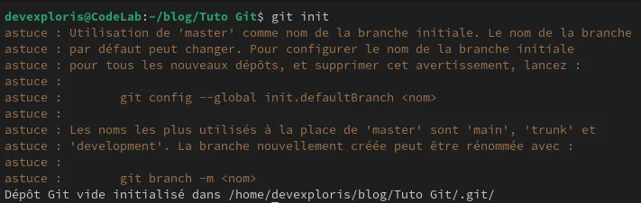Git nous signale que l’on peut changer par défaut le nom de la branche qui est créée dès le début (utilise la commande qu’il te suggère pour paramétrer tes futurs repos et enlever le message).