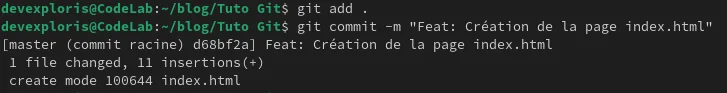 Git détecte alors le nombre de fichiers changés (ici 1) et le nombre de lignes ajoutées / supprimées (11 insertions).