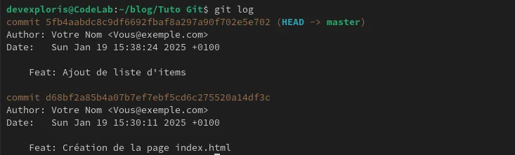 On y retrouve le nom de l’auteur du commit, la date et le commentaire. (Pour l'exemple je n'ai pas changé l'auteur par défaut).