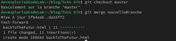 Par contre, à un moment donné, je vais devoir faire rejoindre master à nouvelleBranche (puisque nouvelleBranche sera plus avancée que master). Une fois que je suis satisfait de mon travail, je vais fusionner ma nouvelleBranche à ma branche master.