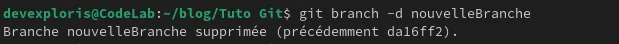 Si tu n’as plus rien à faire sur ta branche nouvelleBranche alors tu peux la supprimer pour que ce soit plus propre dans ton repo à l’aide de la commande :