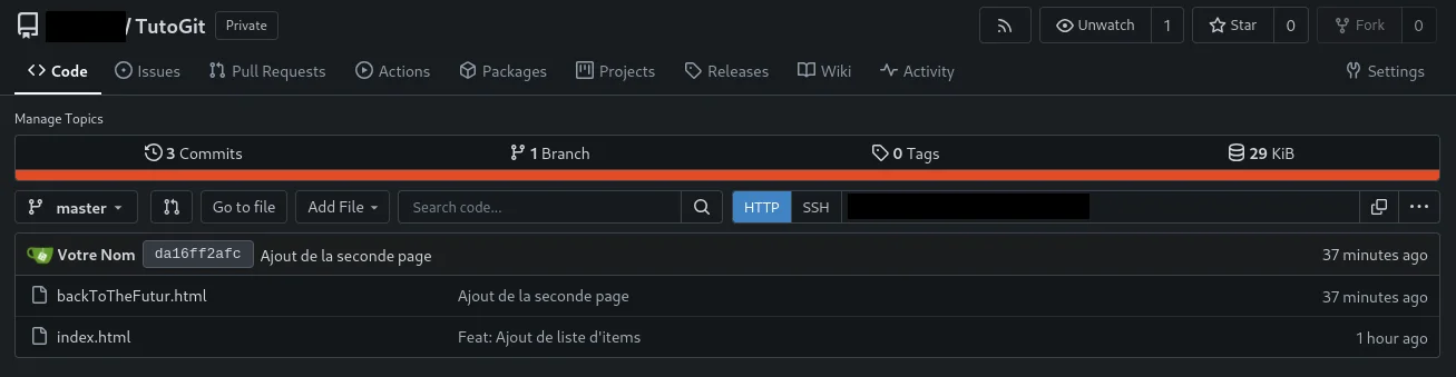 (à présent la seconde page html a disparu puisque nous sommes passés de la nouvelle branche à master et que la seconde page se trouve dans nouvelleBranche).